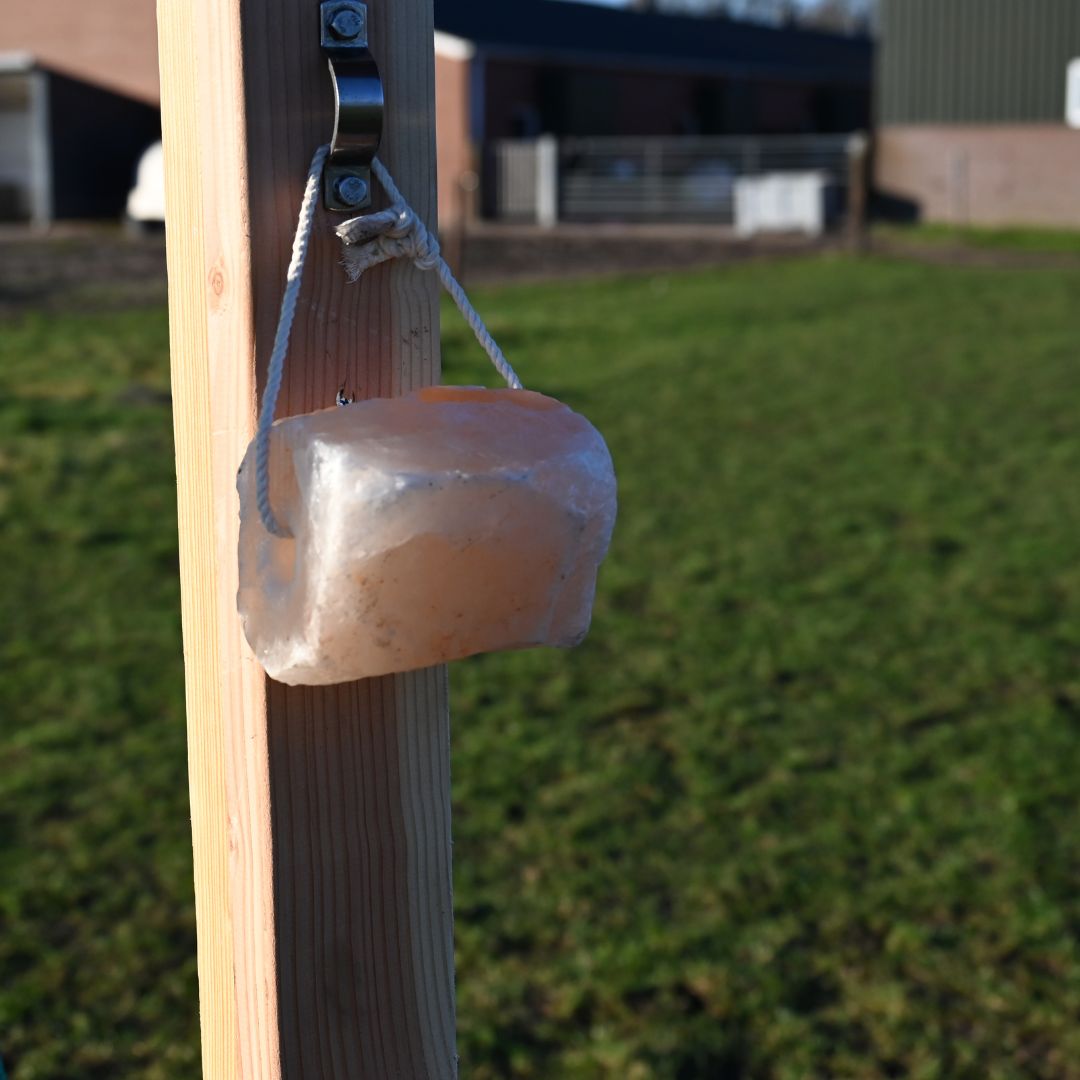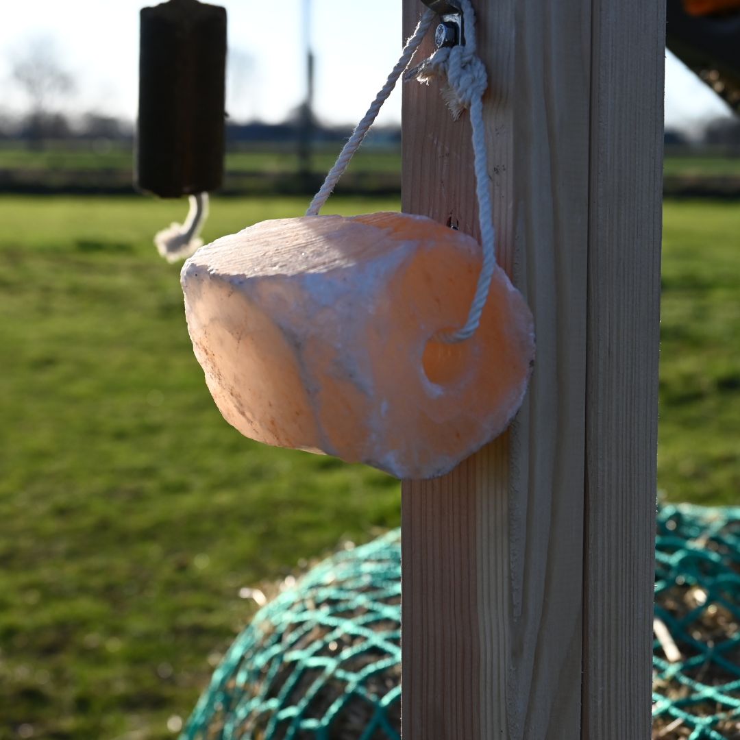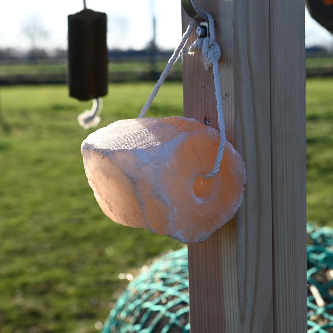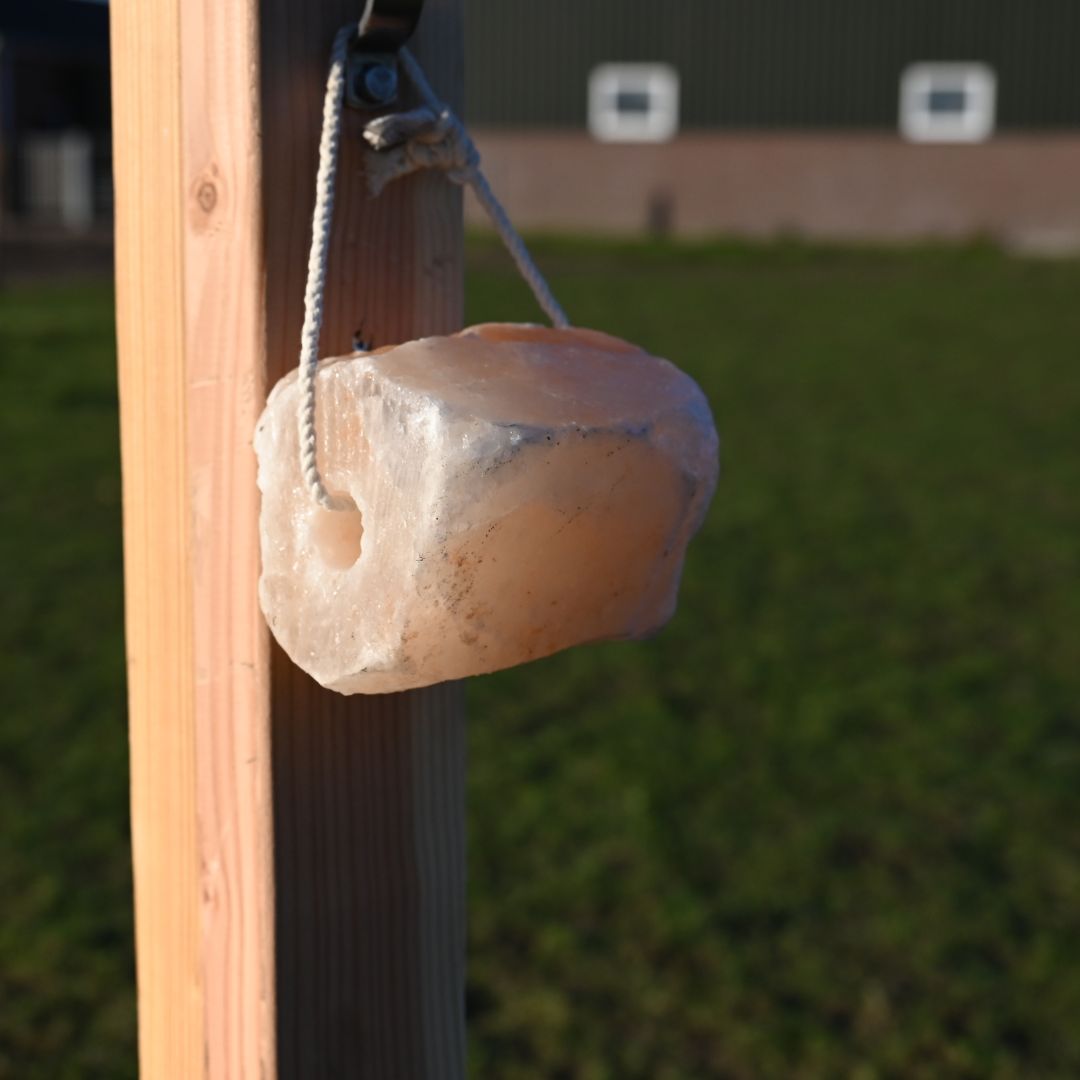 De steen is voorzien van een sterk ophangtouw, zodat je hem eenvoudig kunt ophangen in de stal, op de paddock of in de trailer.