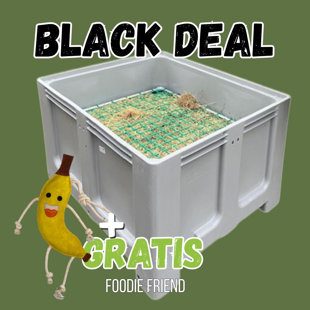 Onze slowfeeder XXL heeft een inhoud van ongeveer 1 kuub en is eenvoudig te vullen. Door het gewicht en de omvang van de bak staat de Slowfeeder XXL stevig in paddock of weide. Het is niet nodig om de bak aan de grond te bevestigen.
